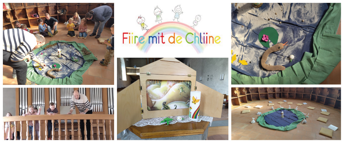An diesem prächtigen, sonnigen Samstagmorgen trudelten 9 Kinder mit ihren Begleitpersonen auf den Berg in die Kirche. Blaues Tuch – grüner Kreis in der Mitte, was das wohl wird? Jedes Kind durfte sich ein Säcklein nehmen und schnell wurde klar, was der Inhalt, zusammen mit der blaugrünen Mitte werden soll = ein Teich. Sogar ein Frosch kam zum Vorschein. Und um diesen Frosch ging es in der Geschichte. Noch ganz klein, als Kaulquappe, entdeckte Quappito den Teich. Freute sich seines Lebens und genoss es, so schnell durchs Wasser zu flitzen. Doch sein Körper veränderte sich zusehends, es wuchsen ihm plötzlich Beine und Arme. Er hatte keine Ahnung wieso und für was. Es bedrückte ihn immer mehr und er wurde sehr traurig. Bis die Schlange sich ihm zuwendete, er plötzlich Angst bekam und schwupps – aus dem Teich sprang. Aha, dafür waren die Beine. Alles klar! Nun vertraute er darauf, dass Gottes Plan richtig ist und alles seinen Sinn.