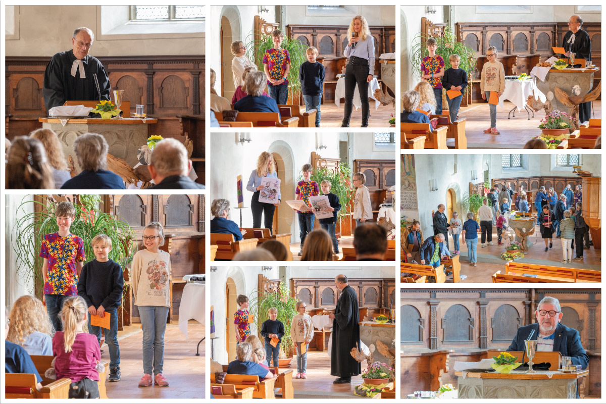 … hilf uns! Stoppe den Sturm!“ Jesus, der im Boot auf einem Kissen schlief, während die Jünger bangten und in grosser Sorge waren, erwachte und beruhigte den Sturm. Danach fragte er erstaunt: „Weshalb habt ihr denn Angst? Gott und ich sind doch bei euch.“ „Ja, aber siehst du denn nicht das viele Wasser im Boot? Und wenn du schon den Sturm stillen konntest, dann könntest du auch das Wasser aus dem Boot zaubern.“ Gesagt – getan! „Ja, aber da gibt es ja noch Löcher zu stopfen im Schiffsboden!“ Die Jünger taten dies aus eigener Hand. Diese Gedanken der Drittklässler zur biblischen Geschichte vom Seesturm wurden theatralisch im Gottesdienst eingebettet und waren sehr beeindruckend. Sie liessen den Text in einem neuen Licht erscheinen und boten einen Steilpass zu einer spannenden Predigtauseinandersetzung.