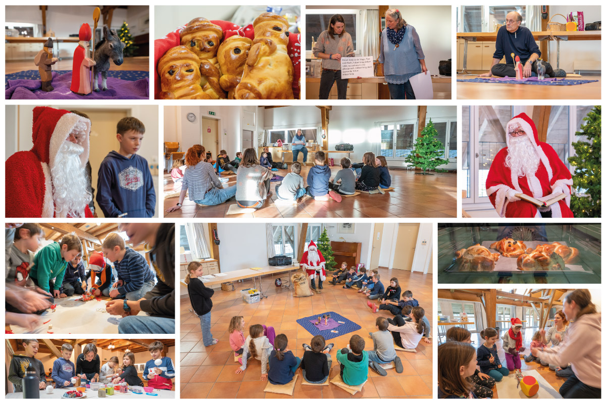 So klingelte es plötzlich, mitten im Bänzlibacken. Schnell stiegen die Kinder die Treppe hoch und wer stand im Eingang, mannshoch und rot bemantelt? Ja, genau, der St. Nikolaus. Der schwere Sack auf dem Rücken und das goldene Buch unter dem Arm. Die Kinder führten ihn erführchtig in den Saal, stellten ihm einen Stuhl hin und hingen an seinen Lippen. Er sprach andächtig und wertschätzend zu uns allen. Wir sangen ihm dafür ein schönes Samichlouslied vor. Nachdem fast jedes Kind ein Värsli sprach, erhielten wir alle einen Säcklein. Mit den besten Wünschen für den weiteren Weg verabschiedeten wir uns von ihm und er zog davon. Danke, lieber Samichlous und bis zum nächsten Jahr!