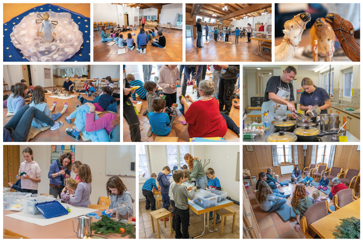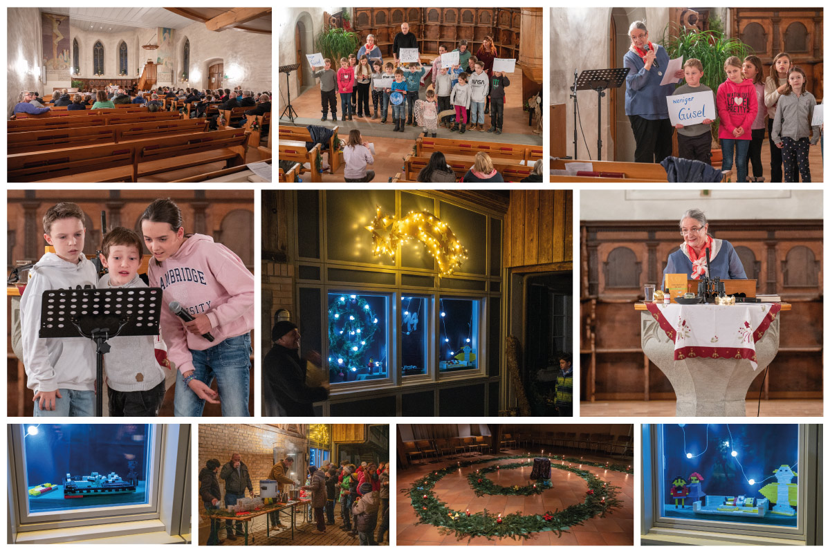 Die Kinder-Weihnacht beginnt um 17 Uhr. Draussen ist es dunkel – in der Kirche leuchten die Kerzen. Die Dekoration hängt an den Bänken und macht eine festliche Stimmung. Mit dem ersten Lied ‚häbet Sorg‘ führen die Kinder die Gäste ins Thema ‚Weniger ist weniger‘ ein. Sorge tragen zu unserem Planeten, das haben sie bei verschiedenen KiK-Anlässen in diesem Jahr gelernt. Auf Plakate haben sie ihre Wünsche geschrieben: weniger Autofahren, weniger Güsel, weniger Probleme, weniger arme Menschen... Wir folgten dem Gespräch von drei Kindern, die versuchten herauszufinden, was sie Jesus schenken wollen; eine Träne, Freude und ein Lied, etwas Geld aus dem Kässeli für arme Menschen. Und sie fragten, was schenken wir Jesus?