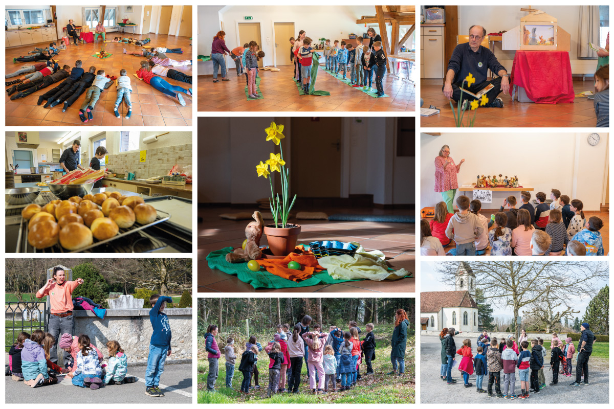 Mit dem Lied von Andrew Bond ‚Überall isch Gott‘ begrüsst eine grosse Schar Kinder und alle Helfenden den heutigen Tag. Ein Rätsel der vier Jahreszeiten bringt uns dem heutigen Thema schon näher. Es führt uns zum Frühling. In der Geschichte vom Hasen Pauli erfahren wir, wie es ist, vom Osterhasen überrascht zu werden. Ein kleines Osternest für Pauli, der allen anderen etwas versteckt hat, ist auch für ihn versteckt. Von wem wohl?