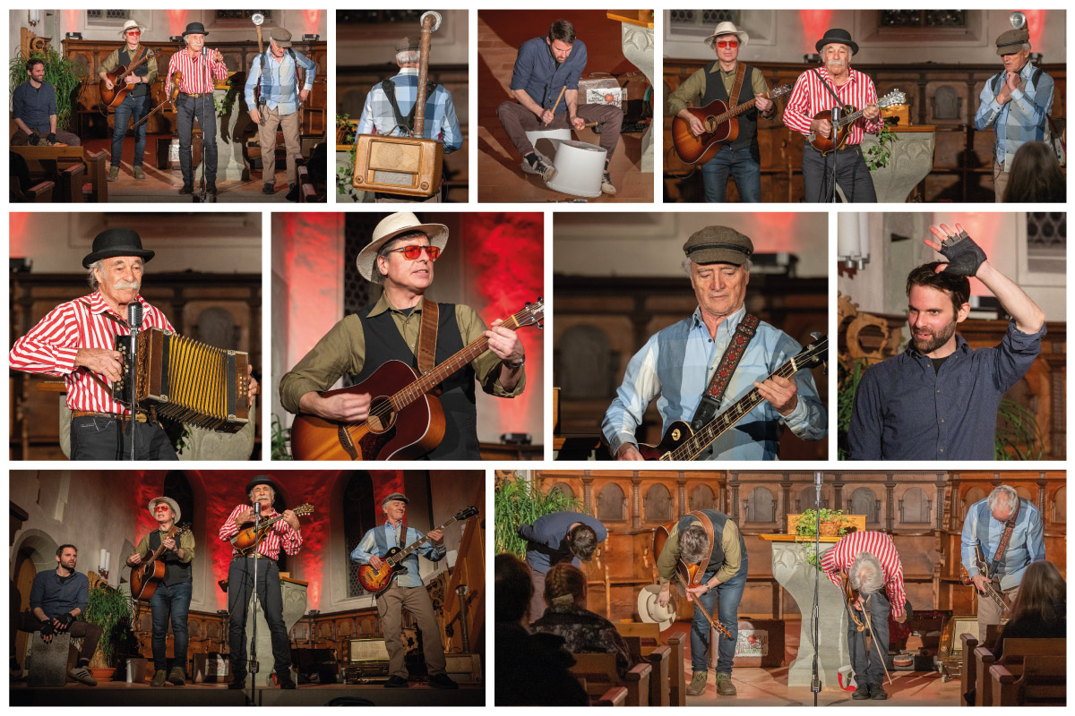 Sehr einnehmend: Zuerst die Begegnung mit der unvergleichlichen Linde (sie hat hunderte von Jahren dort überlebt, spricht für den Ort!), dann die Kirche mit den aufmerksamen und freundlichen Leuten und natürlich: Wilhelm Toll mit ihrem Swiss Mountain Rock’n’Roll – vier Vollblutmusiker, die immer wieder für Freude und herrlichen Life-Musikgenuss sorgen. Gespielt wurde auf Fiddle/Mandoline, Bluesharp, div. originellen Instrumenten (Schlauch-Alphorn, Löffel, altes Akkordeon), begleitet von Gitarre, Holzkisten- und Radio-Bass, sowie auf Cajon (Holzbox-Drum) und dem Farbkübelschlagzeug - genial! Auch für Überraschungen war gesorgt: oder hast du, Gemeindemitglied, damit gerechnet einen Auftritt als Eisberg zu haben?