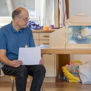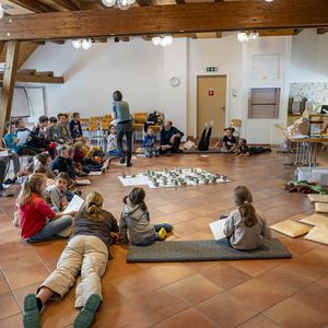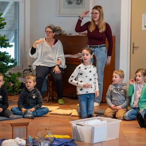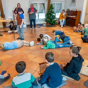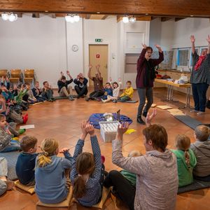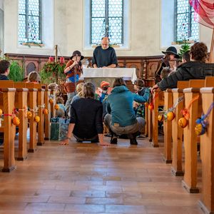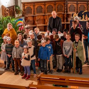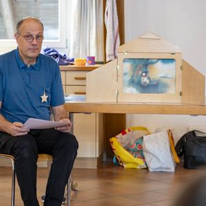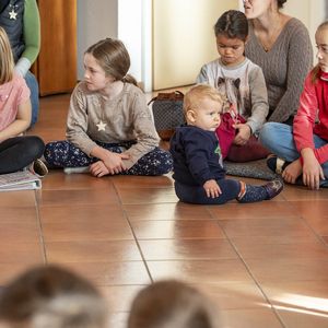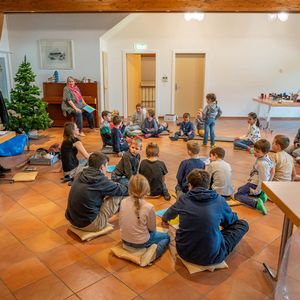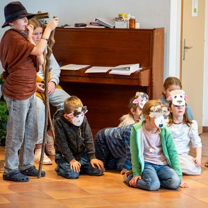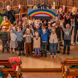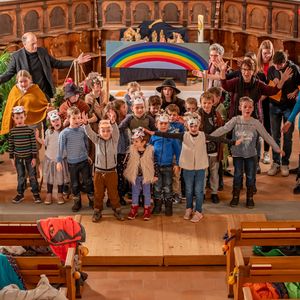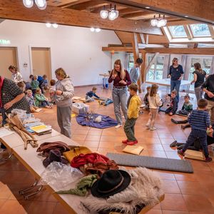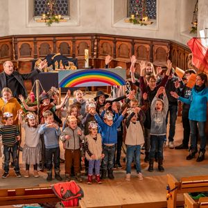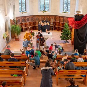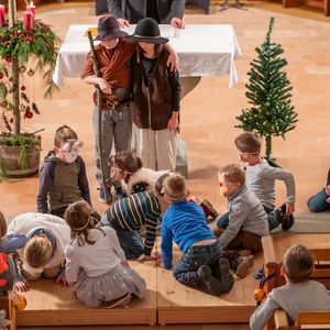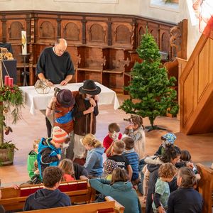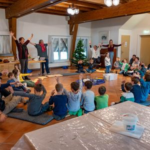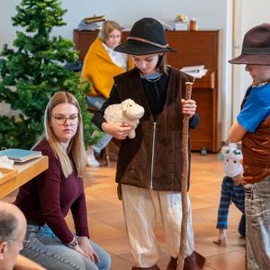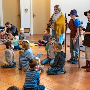 Über dreissig Kinder, gross und klein, erfüllten das Kirchgemeindehaus mit Lachen und Singen. Gespannt hörten sie die Geschichte von dem kleinen Hirten Simon und seinem verlorenen Schaf. Herr Weber erzählte die Geschichte nicht zu Ende, das Schaf ist immer noch verschwunden...