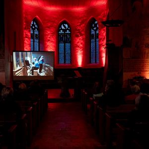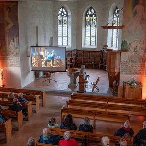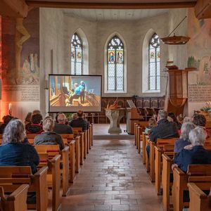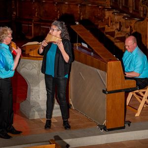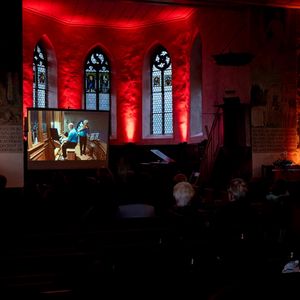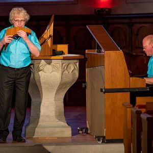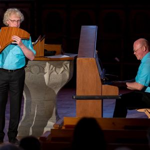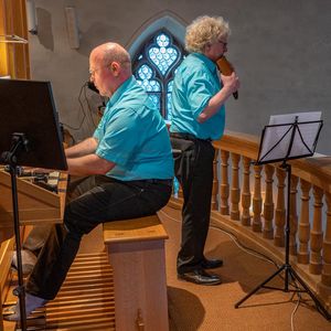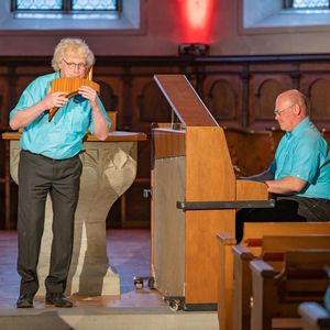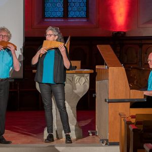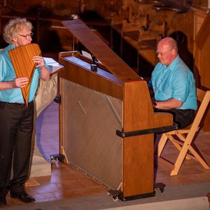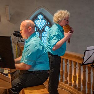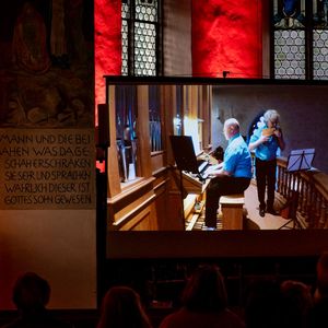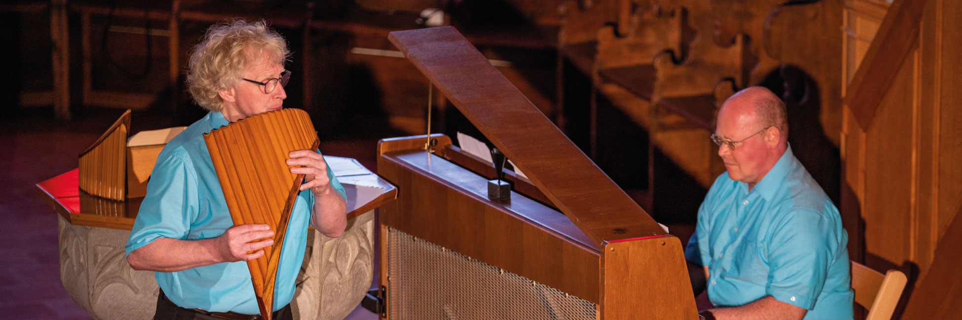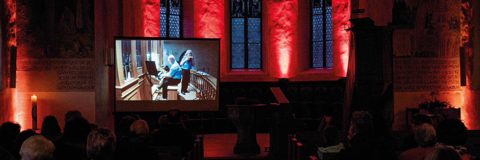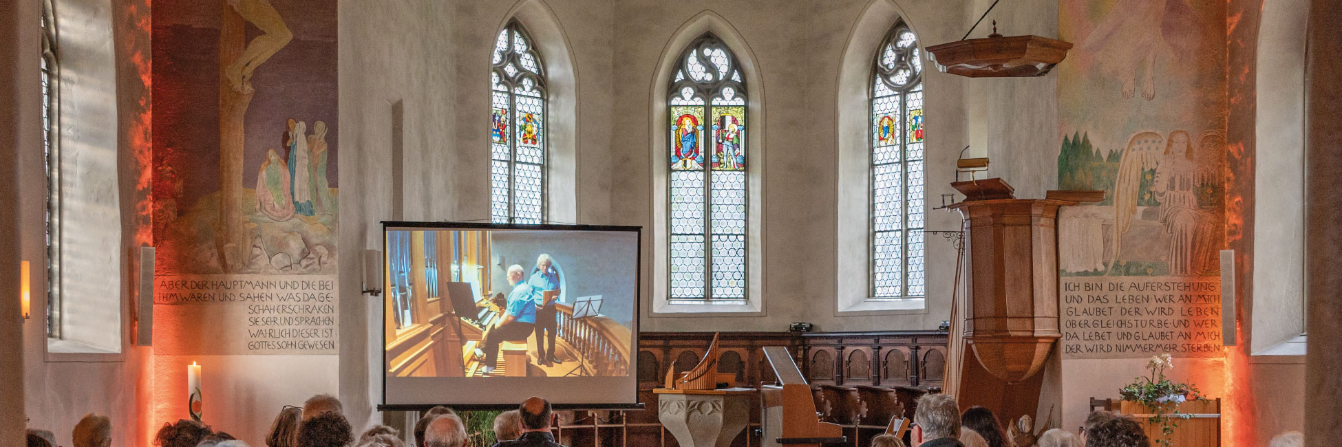 Die zahlreich erschienen Konzertbesucher staunten nicht schlecht, als im Chor unserer Kirche nebst dem Klavier auch noch eine Leinwand zu sehen war, jedoch keine Musiker. Jörg Frei und Georg Masanz spielten die ersten Stücke auf der Empore und zur Freude der Anwesenden wurde dies „Live“ auf die Leinwand übertragen. Die beiden Musiker sind seit rund 30 Jahren ein eingespieltes Team und dies wurde den Zuhörern schnell klar. Das Zusammenspiel der beiden aerophonen Instrumente, Panflöte und Orgel, war von Anfang an ein Ohrenschmaus.