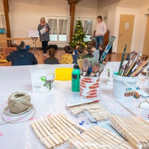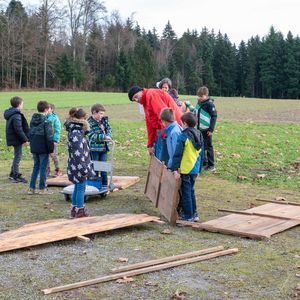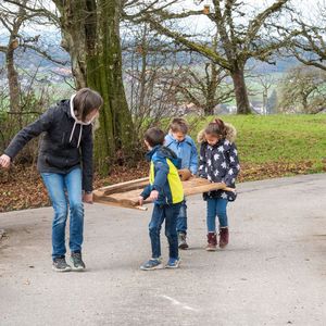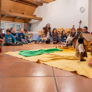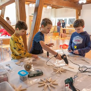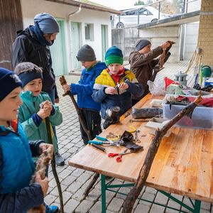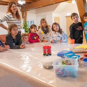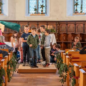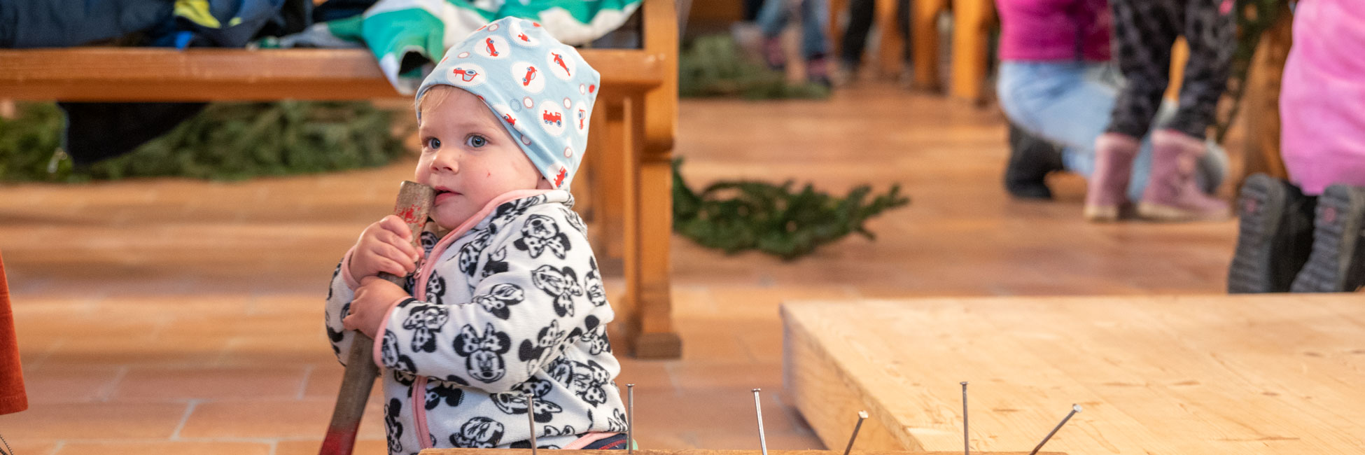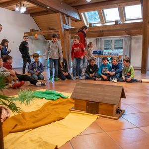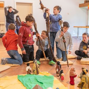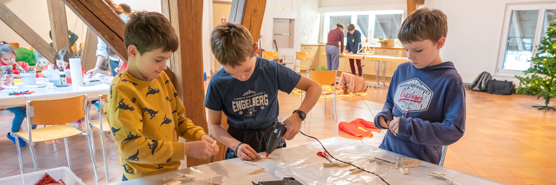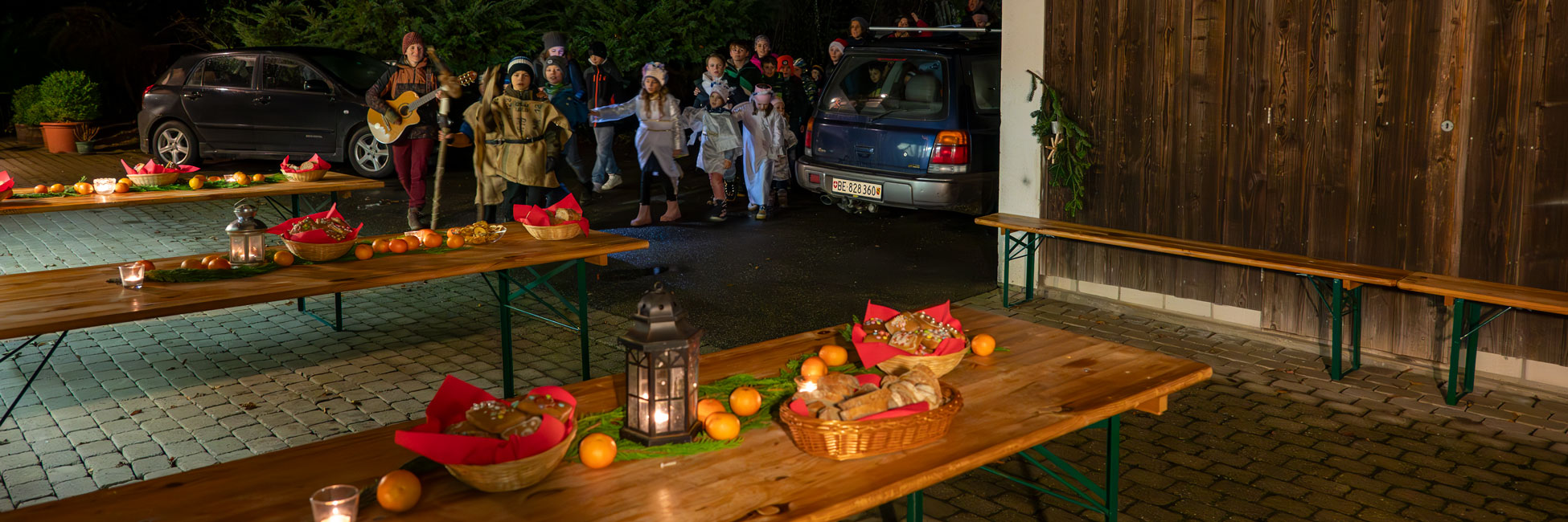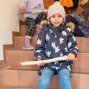Ja, das wollten wir auch. Wir begannen mit dem Lied 'Mir boue zäme e Stall'. Zu diesem Stück gehörten 5 Theater-Kinder, Hirten und Engel. In den Werkstätten lasen die Kinder den Text, bastelten Engelskränze oder suchten im Wald einen echten Hirtenstab zum Schmücken.
