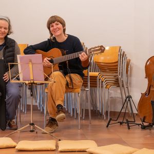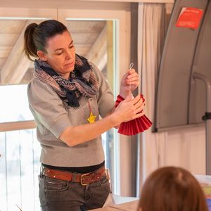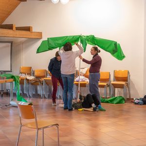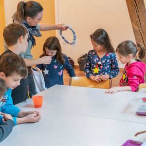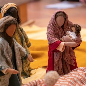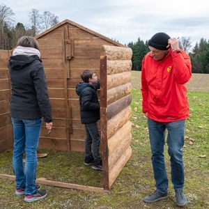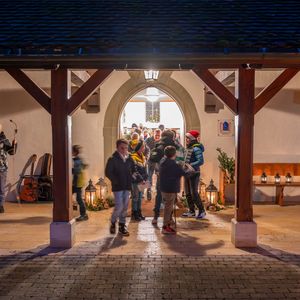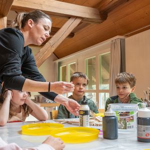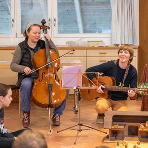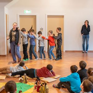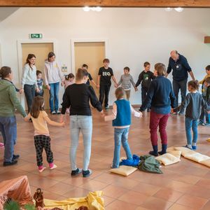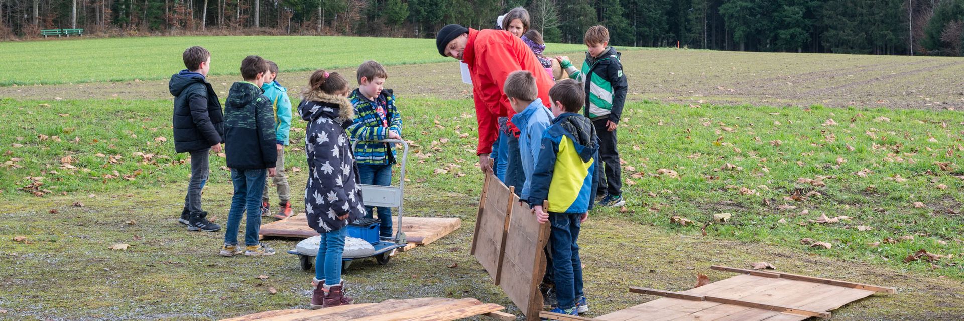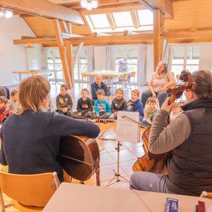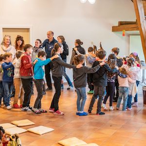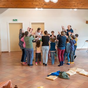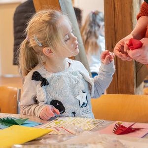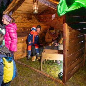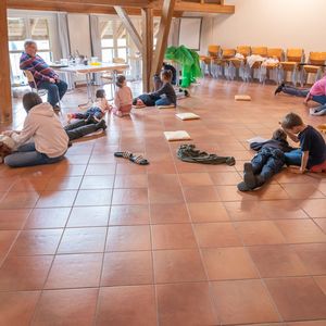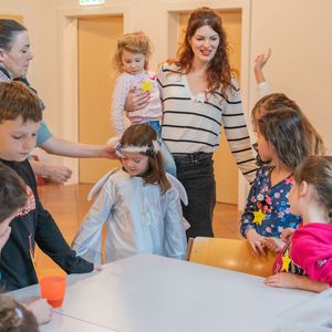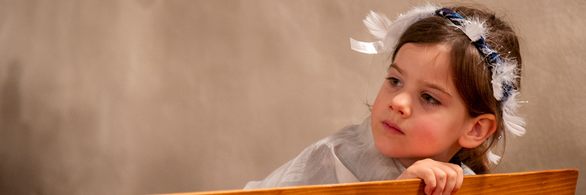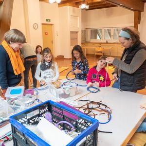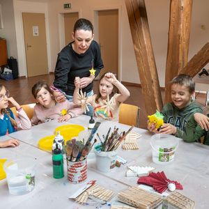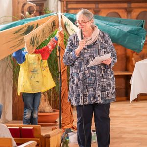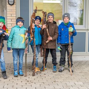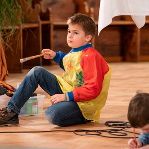Ja, das wollten wir auch. Wir begannen mit dem Lied 'Mir boue zäme e Stall'. Zu diesem Stück gehörten 5 Theater-Kinder, Hirten und Engel. In den Werkstätten lasen die Kinder den Text, bastelten Engelskränze oder suchten im Wald einen echten Hirtenstab zum Schmücken.
