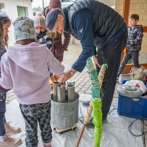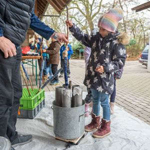 Die Kinder machten engagiert mit. Zwischendurch tauchten sie die selbstgemachten Fackeln in den Wachstopf. Mmmmhhh, ob die wohl gut brennen werden...?
