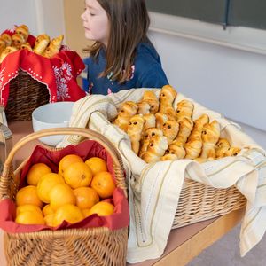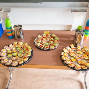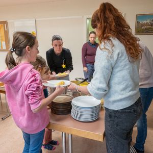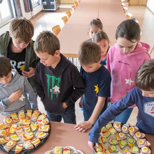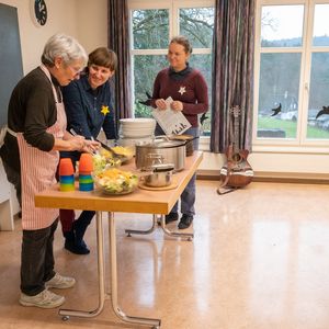 In der nächsten Stunde übten wir mit Nadine und Janna die Lieder für die Weihnachtsfeier. Das Lied vom Thema 'Mir boue zäme e Stall' erklang wie bei Profis, die Erwachsenen staunten nur so. Was für eine Kraft, wunderbar! Danach war Fackeln machen, Dekoration basteln und eine Palme zaubern angesagt. Uff, ganz schön viel Arbeit. Da haben wir uns ein leckeres Mittagessen verdient.