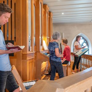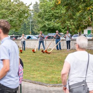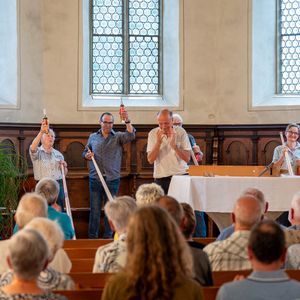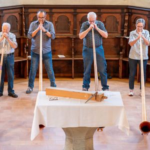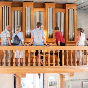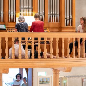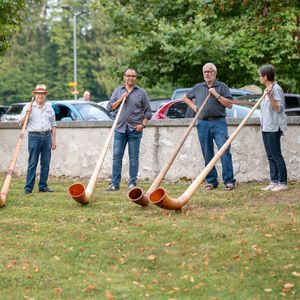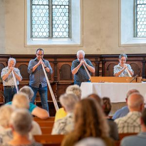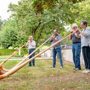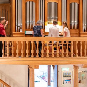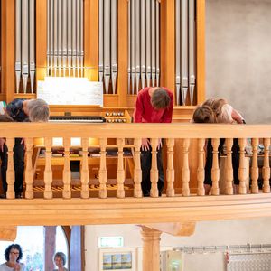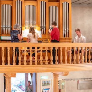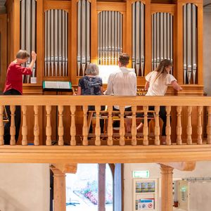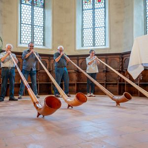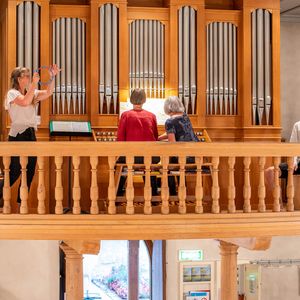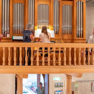 Während der Pause wurde in Orgel in zwei kurzen Führungen vorgestellt. Ein Blick in das Innere der Orgel beeindruckte. In der Pause überraschten vier Alphörner (gespielt von Max Sommer, René Hüsser , Elisabeth Röthlisberger und Ueli Lanz) die Besucherinnen und Besucher mit ihrem Spiel neben der Kirche. Scheinbar spontan wurden die Spielenden eingeladen, doch in der Kirche zu spielen. Was für eine Überraschung als diese "spontan" zusagten und was für ein Schrecken, als die Stühle aus dem Chor verschwunden war.