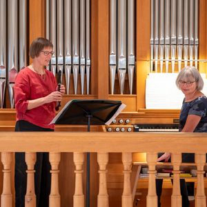 "E Freudetag" - ein von Max Sommer komponiertes Stück im Zusammenspiel mit der Orgel war von den vier gespielten Stücken zweifellos das ergreifendste. Wurde dieses doch vor 20 Jahren in der Kirche Uraufgeführt. Mit den Alphörnern war der Bogen zum volkstümlichen Teil geschlagen. Ja - auch das auf einer Orgel möglich. Stücke von Glauser, Röösli und Lavarini wurden mit Sopran- bzw. Altblockflöte dargeboten.