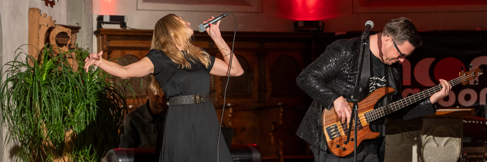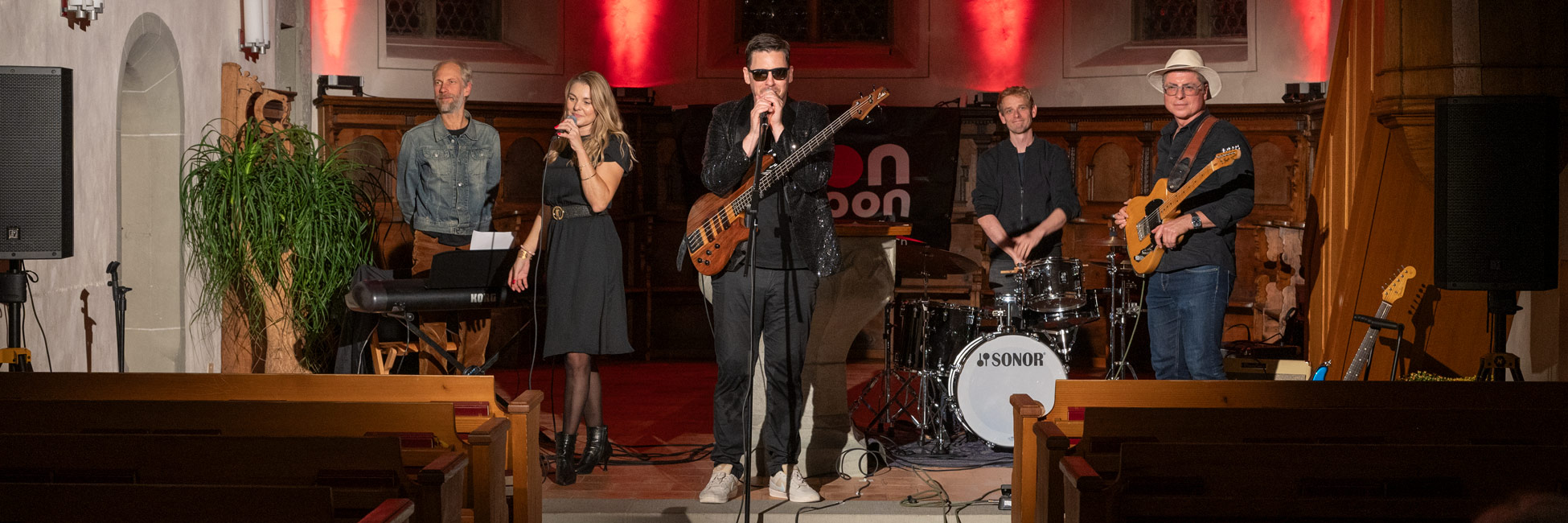Die Scheinwerfer gleissen, die Sonnenbrille sitzt. Und spätestens als unsere „Lady Marmalade“, Andrea, die Bühne stimmgewaltig betritt, sind Band und Publikum auf Betriebstemperatur. „I feel good“ daher die logische Folge. Wir geben alles, das Publikum nimmt dankbar auf, klatscht im Takt und die Kirche hallt freudig mit. Bekannte Covers von Funk-, Soul- und zuweilen Rock-Klassikern und vereinzelte Eigenkompositionen – in der Zugabe eine spontane Publikums-Tanzeinlage und Standing Ovations. Was will man mehr an einem Samstagabend in der Kirche? Genau: Ein Halleluja!! Das lieferten Band und Publikum zur lautstark herausgeklatschen zweiten Zugabe „Uptown Funk“ gleich selbst. Uptown ist heute Abend hier, auf dem Berg. Danke, Kulturkirche Seeberg. Wir kommen wieder, wenn die Mar(o)oni-Zeit anbricht!
