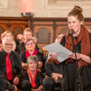In der Mitte des Konzertes kam ein weiterer Höhepunkt aus unseren Reihen. Monika Wynistorf, Altsängerin unseres Chores, hat für uns ein bärndütsches Gschichtli verfasst. Mit viel Charme und Witz liess sie nicht nur den laufenden Workshop, sondern auch die letzten 13 Jahre Gospelworkshop Revue passieren, nämlich als 2012 alles seinen Anfang nahm als Ruth Huber in den Vorstand der Landfrauen Seeberg kam und seither als Organisatorin alle Fäden für dieses tolle Projekt in der Hand hat. Danke Ruth für dieses Herzensprojekt!