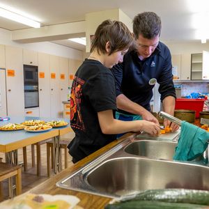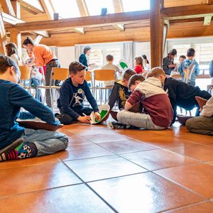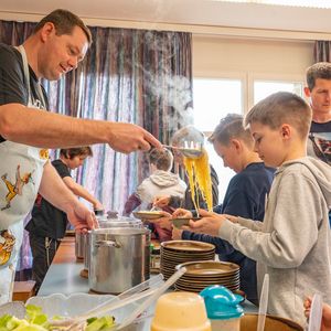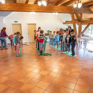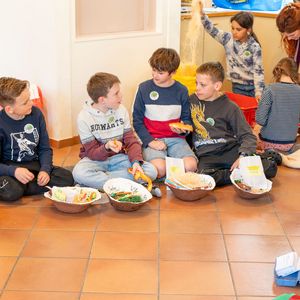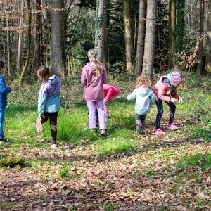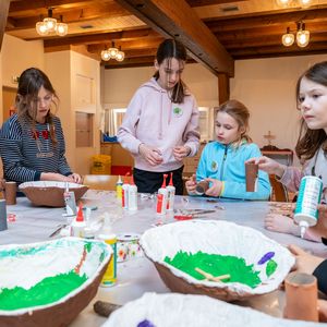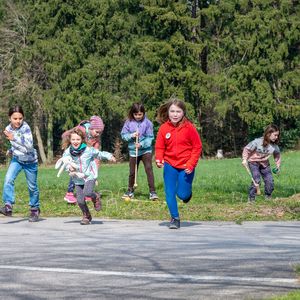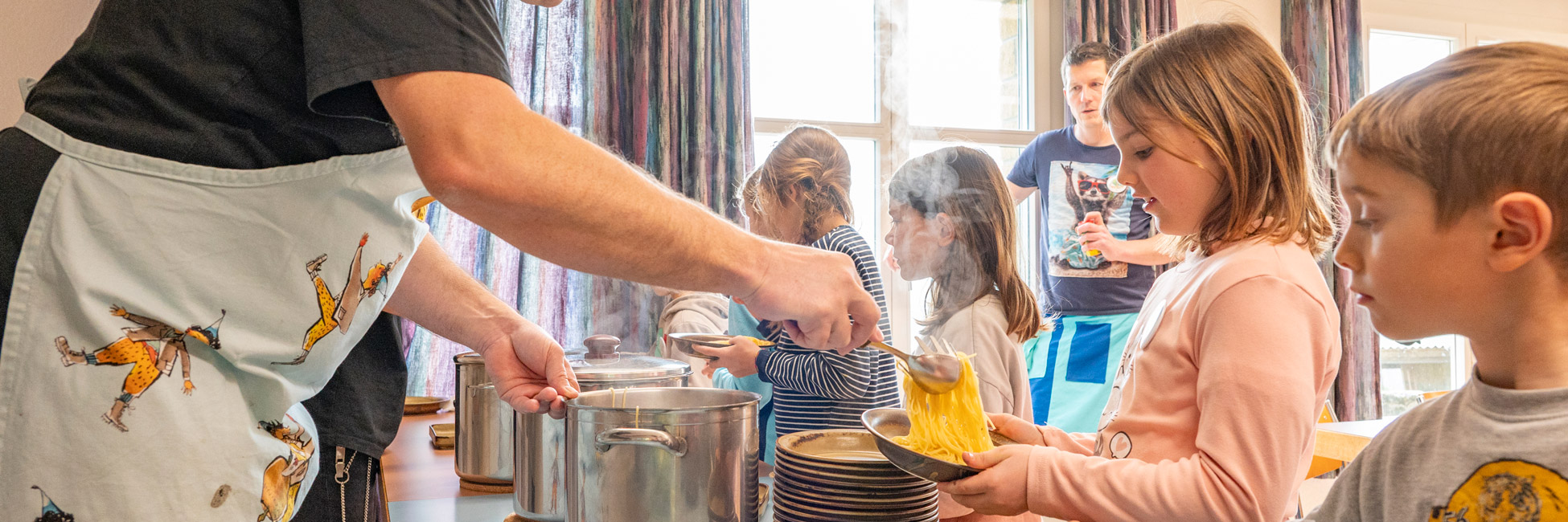 Bei Salat, Spaghetti und leckeren Saucen fand die Schar wieder Kraft und Energie. Der Nachmittag galt den Spielen in der Natur. Im Wald und auf dem Platz wurde gewerkelt und Eier eingepackt, Kugeln geschoben und Hasenohren gezeichnet. Viele dieser Spiele durften sie in einem selbstgebastelten Hasen, aufgeschrieben auf Papier, mit nach Hause nehmen. Für Ostersonntag-Nachmittag, wenn die Erwachsenen mit den Kindern spielen wollen – oder umgekehrt...